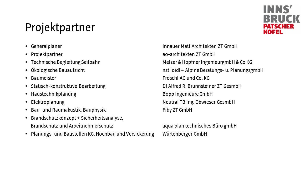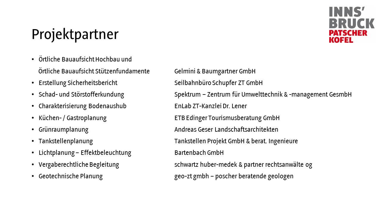 Die Seilbahnplaner Melzer & Hopfner Ingenieurgesellschaft mbH & Co. KG standen als Experten der Patscherkofelbahnen GmbH zur Seite, sie weisen als Referenzen unter anderem den Katschberg, Galtür und Saalbach auf. Weitere Experten sind NST Loidl, Alpine Beratungs- und PlanungsgmbH, die für die Hinterglemmer Bergbahnen, die Bergbahn AG Kitzbühel, die Skiliftegesellschaft Sölden/Hochsölden GmbH, die Axamer Lizum Aufschließungs AG und die Bergbahn Lofer GmbH tätig sind. Eigene GutachterInnen gab es für die Bereiche Lawinengefahren, Geologie und Wetter.