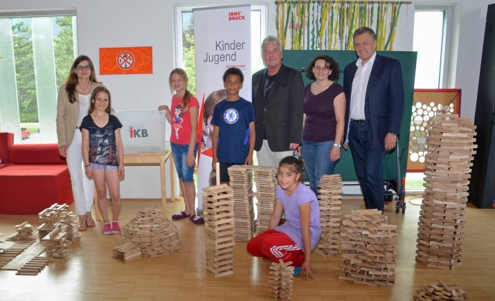 Über zwei große Boxen voller Holzklötze konnten sich die Kinder des Schülerhorts Olympisches Dorf am 2. Juli freuen. Von MitarbeiterInnen der Innsbrucker Kommunalbetriebe AG (IKB) wurden die Bauklötze in den Schülerhort gebracht. Am Nachmittag besuchten Bildungsstadtrat Ernst Pechlaner, Amtsleiterin Mag.a Brigitte Berchtold (Kinder- und Jugendbetreuung) und DI Reinhard Oberguggenberger (IKB) den Hort und konnten beeindruckende Bauwerke bestaunen.